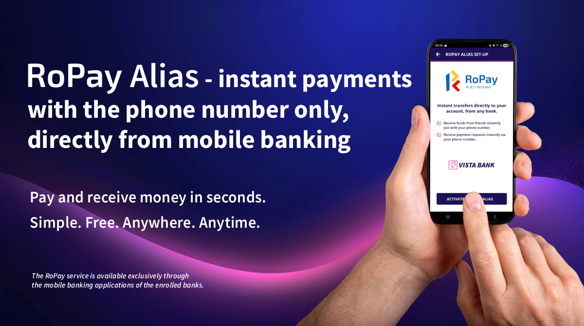 Vista Bank expands its digital services with a new feature: RoPay Alias – payment using only a phone number through the national instant payment system RoPay developed by TRANSFOND. RoPay Alias complements the RoPay services offered by Vista Bank to individuals – RoPay Contactless and RoPay QR Code, launched this summer.